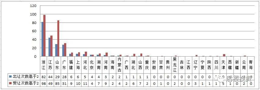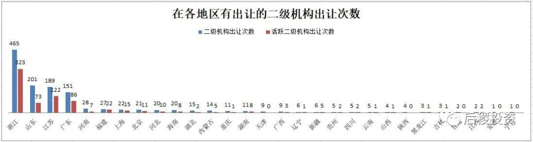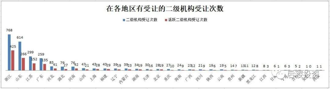 從主體數量上看,二級機構市場參與主體集中在東部地區,其中浙江、江蘇和廣東的活躍二級機構占總二級機構比例均約為50%,而山東的活躍二級機構占比約為20%。而其他地區有出讓記錄的二級機構主體數量零星可數,這一方面是因為相比東部省份,二級機構參與市場成交確實相對較少,另一方面則是因為二級機構轉讓大部分,特別是民營機構并不需要走公告流程,故數據上難以體現。