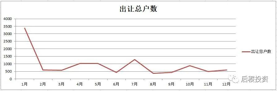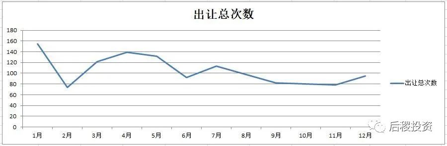 全年1月份出讓份額最高,這是各機構在12月底沖業績,公告反映在1月份。其余時間月出讓次數區間中值為100次,上下浮動40戶以內,戶數中值為750戶,上下浮動250-300戶,金額中值為40億,上下浮動20億。