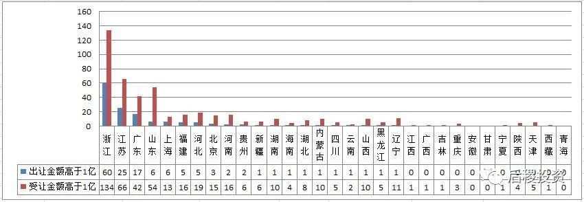 與出讓類似,受讓二級機構主體最多的省份還是浙江、江蘇、廣東和福建,上海的排名有所后移。而活躍二級投資人主體數量占全部二級投資人數量的比例較出讓有下降,這個數據反映了當地二級機構的競爭激烈程度,占比越小的地區,二級機構間的競爭越激烈。