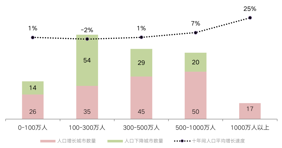 十年間,常住人口在繼續(xù)向大城市集聚已經(jīng)成為人口流動(dòng)的重要特點(diǎn)。近十年增加的人口都在向500萬(wàn)、尤其是1000萬(wàn)以上人口城市集聚。而100-300萬(wàn)城市人口十年間下降的城市數(shù)量占比超過六成,成為了大中城市流動(dòng)人口持續(xù)增長(zhǎng)的重要“糧倉(cāng)”。