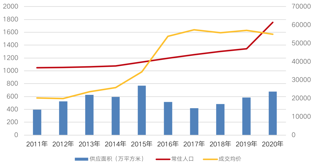 較低的落戶門檻一定程度上會(huì)刺激深圳樓市走向高房?jī)r(jià)、高成本。表現(xiàn)在房地產(chǎn)市場(chǎng),受人口需求端刺激,深圳新建商品住宅成交均價(jià)從2011年至2020年,增長(zhǎng)至54949元/平方米,十年間增長(zhǎng)168%。