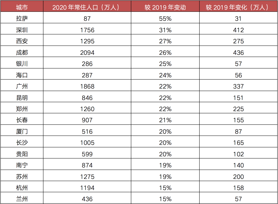 其中較2019年人口變化比較大的深圳位于前列。按照“七普”人口數(shù)據(jù),2020年常住人口較2019年增加412萬(wàn)人,增長(zhǎng)達(dá)31%。