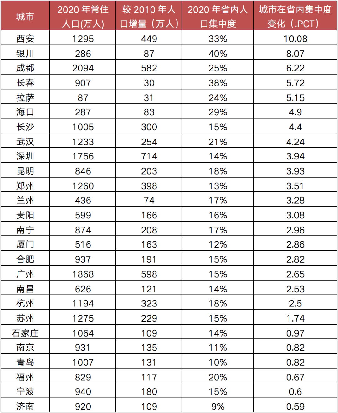 表:核心城市常住人口、集中度變動(dòng)