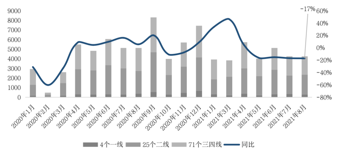 2021年三季度,全國新房成交由二季度“由穩轉跌”趨勢進一步下行,至8月百城商品住宅成交規模連續4個月縮減,單月較2020年和2019年同期降幅擴大至22%和12%,連續6個月縮減。