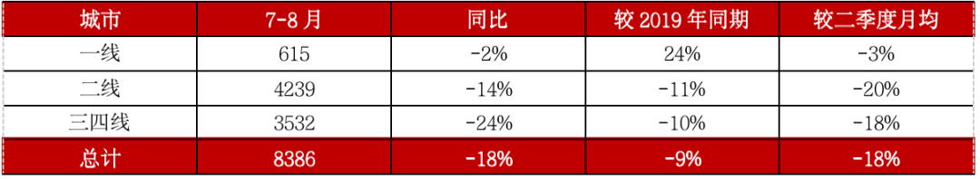 7-8月,全國100個重點城市商品住宅成交面積8386萬平方米,較2020年和2019年同期分別下降18%和9%,月均成交面積相較二季度下降18%。其中,三四線下行加劇,24%的跌幅超百城平均。二線城市中,輪動與分化現象在三季度愈發凸顯,此前沿海高熱城市受政策調控作用明顯降溫,小部分區域中心城市則初見翹尾行情。
