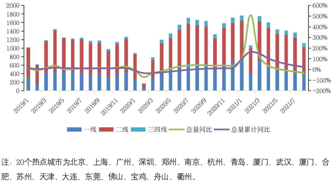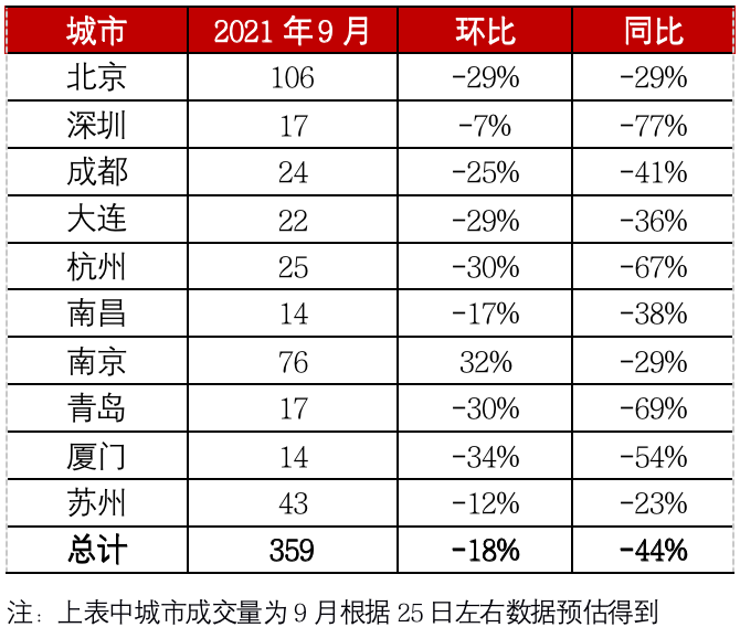 9月,28個重點城市預計成交面積約2000萬平方米,“金九”銷售表現冷淡收場,同環比齊跌,環比降5%,較2020年和2019年同期分別降23%和15%。
