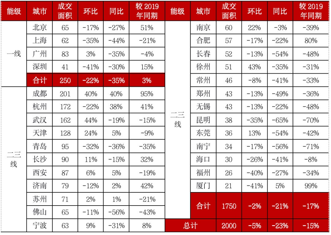 具體城市而言,重點城市保持較高市場熱度,廈門、成都、合肥、濟南、杭州和長沙成交面積較2019年同期上漲30%以上;武漢、西安、蘇州、南京規模環比再增。部分城市樓市下行壓力加大,如南寧、昆明、長春、福州等市場動能明顯轉弱,規模同環比及較2019年同期均有不同幅度下降。
