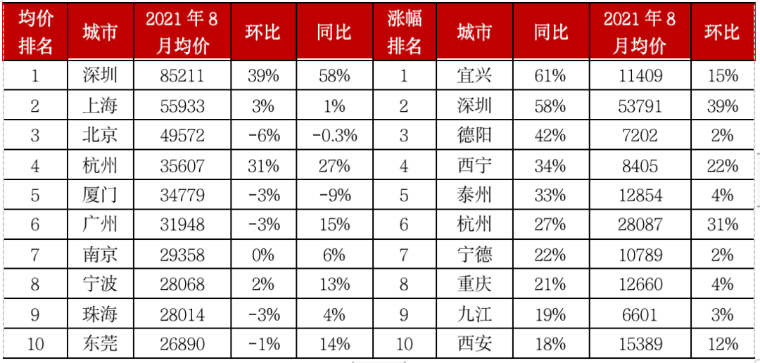 表:2021年8月105個典型城市商品住宅成交均價和價格漲幅TOP10(單位:元/平方米)