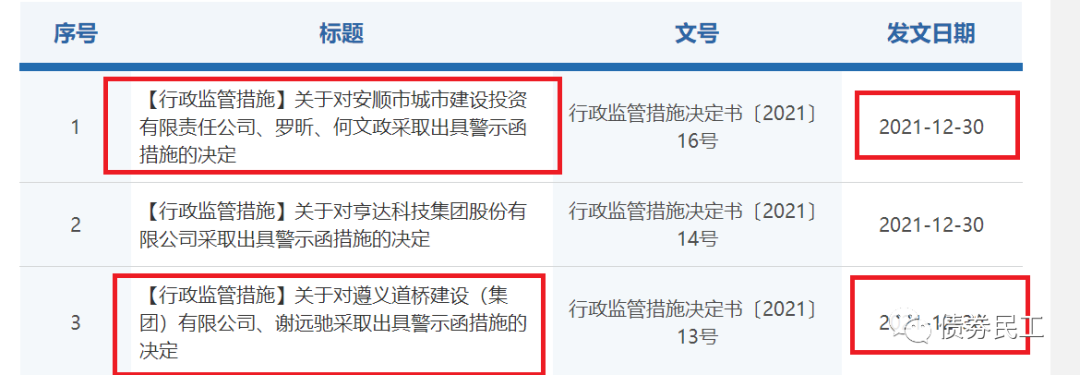 從兩家城投公司公開披露的信息來(lái)看,遵義道橋和安順城投公司收到貴州證監(jiān)局警示函措施決定的日期是一樣的。債券民工查詢了一下貴州證監(jiān)局的官網(wǎng),遵義道橋和安順城投公司兩家城投公司被采取措施的發(fā)文日期均是2021年12月30日,落款日期分別為12月24日和12月27日。
