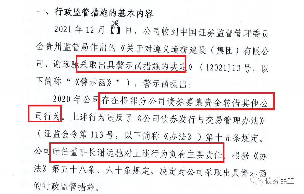 此前的2022年1月4日,遵義道橋建設(shè)(集團(tuán))有限公司(以下簡(jiǎn)稱“遵義道橋”)披露公告(公告蓋章日期為2021年12月31日),遵義道橋于2021年12月28日收到貴州證監(jiān)局的通知,因?yàn)樵?020年存在將部分公司債券募集資金轉(zhuǎn)借其他公司的行為,被貴州證監(jiān)局采取出具警示函措施。公告中未披露遵義道橋轉(zhuǎn)借債券募集資金涉及的具體債券名稱情況。