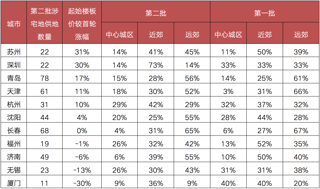 然而,廈門、無錫等城市供地質量整體不如首輪,核心區供地比重有所下降。不僅如此,部分地塊出讓還新增諸多附加條件,以剛剛結束二輪土拍的無錫為例,有超半數地塊設置了額外門檻,如引進品牌酒店、配建人才房或租賃住房、現房銷售、自持商業等;加之“限地價+搖號”的競拍政策,無錫二輪集中土拍“降溫”,平均溢價率只有4%。