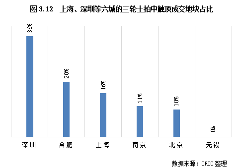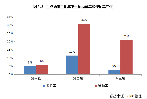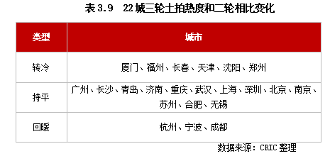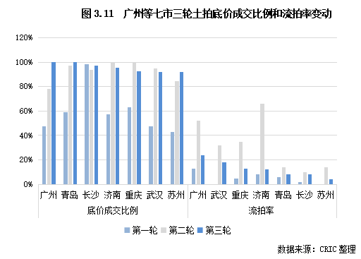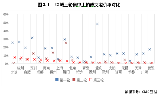 具體城市來看,僅有寧波、杭州、合肥、深圳、成都5城市溢價率達5%及以上,其余城市溢價率均在5%以下,長春、天津、武漢、廣州等城市均全部為底價成交。相比之下,重點城市首輪溢價率大都處于高位,像重慶、深圳、廈門、杭州、寧波等城市溢價率均超20%;二輪雖然熱度明顯下降,但仍有廈門、福州、深圳等少數(shù)城市溢價率超過10%。至于流拍率,雖然第三輪較第二輪明顯好轉(zhuǎn),但依然處于高位,整體流拍率達21%。
