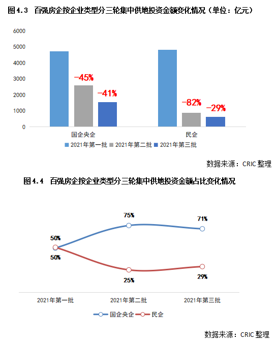 在首輪投資金額相近的情況下,第二輪集中供地中國企央企投資力度下滑45%左右,第三輪又較第二輪下降41%左右;而民企的第二輪投資力度大降82%,第三輪又在此基礎上下滑29%。無論從絕對值還是降幅的對比來看,民企投資受到的影響都更為嚴重。