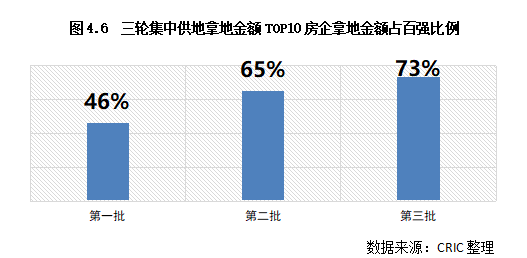 然而在房企大幅收斂投資的情況下,投資TOP10房企的金額集中度還不降反升:首輪集中供地中,投資TOP10金額占百強的46%,這一比例在第二、三輪中攀升至65%和73%。
