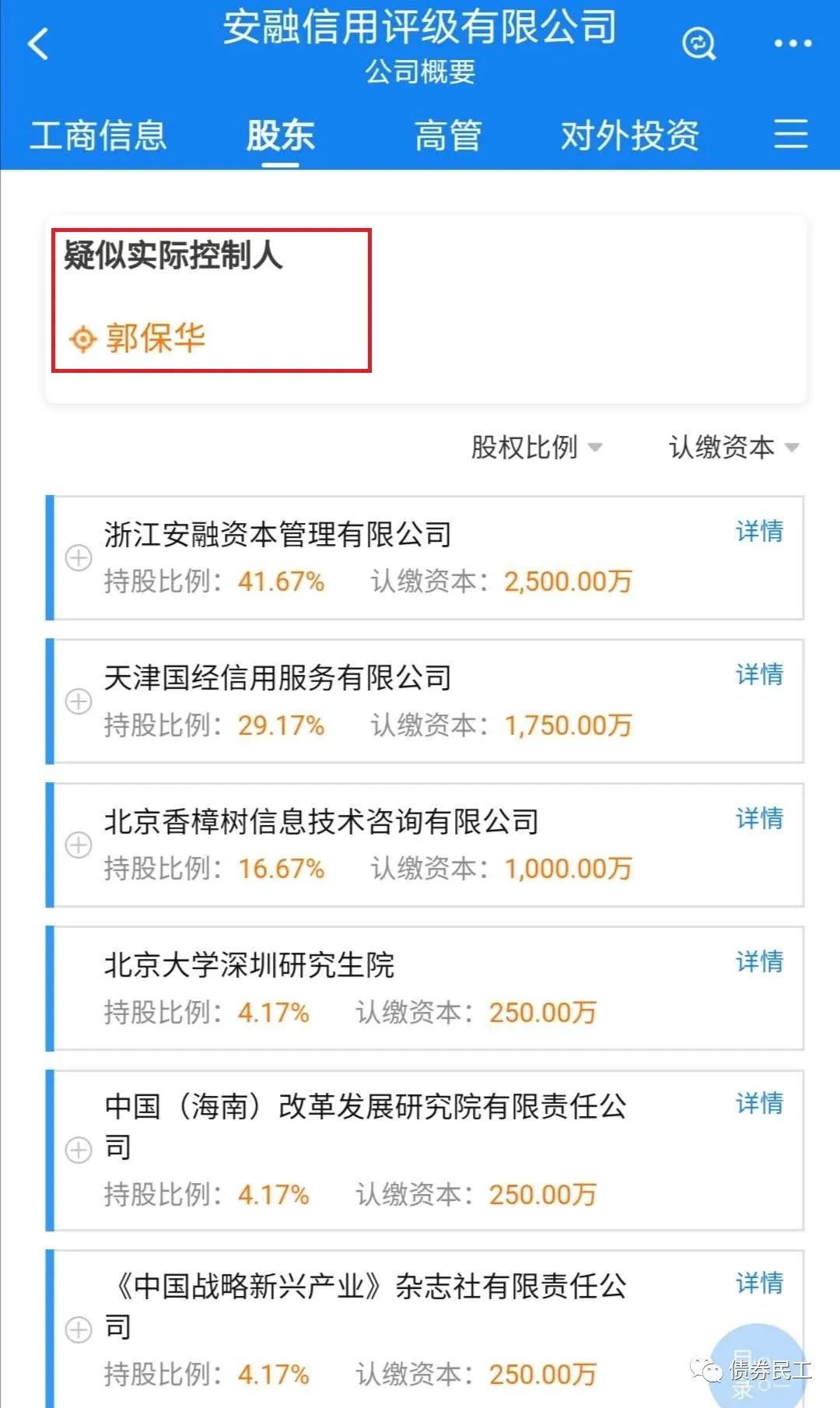 安融信評(píng)的股東為浙江安融資本管理有限公司、天津國(guó)經(jīng)信用服務(wù)有限公司、北京香樟樹(shù)信息技術(shù)咨詢(xún)有限公司、《中國(guó)戰(zhàn)略新興產(chǎn)業(yè)》雜志社有限責(zé)任公司、北京大學(xué)深圳研究生院和中國(guó)(海南)改革發(fā)展研究院有限責(zé)任公司等6家法人單位,疑似實(shí)際控制人為自然人郭寶華。安融信評(píng)的股東結(jié)構(gòu)的確是很引人注意,股東包括了北大、雜志社和研究院。
