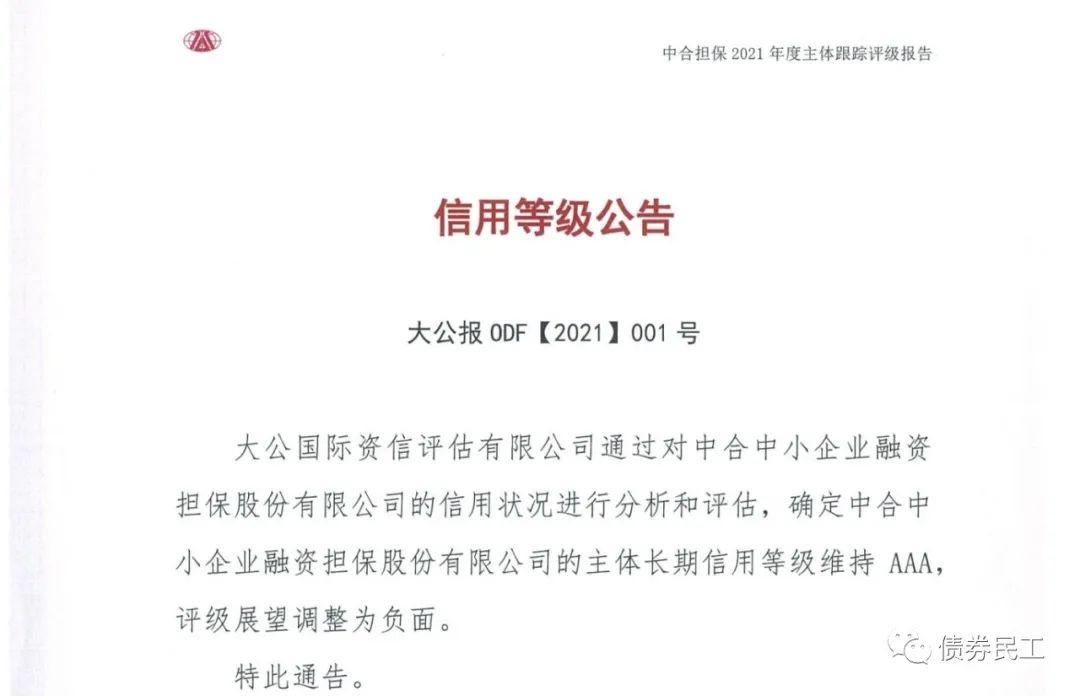 AAA的中合擔(dān)保評級展望調(diào)整為負(fù)面!