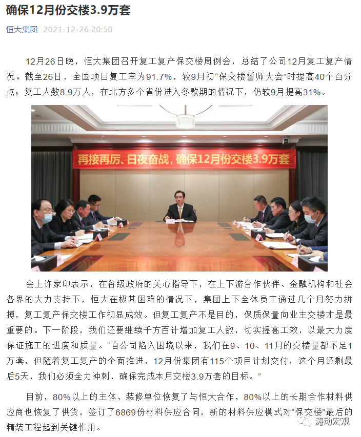 再比如,2021年12月26日晚間,恒大集團官方微信披露恒大集團召開復工復產保交樓周例會,指出目前恒大集團全國項目復工率為91.7%,較9月初“保交樓誓師大會”時提高40個百分點;復工人數(shù)8.9萬人,在北方多個省份進入冬歇期的情況下,仍較9月提高31%。恒大董事會主席許家印特別提及恒大在9、10、11月的交樓量都不足1萬套,而12月份恒大有115個項目計劃交付、將全力沖刺確保完成本月交樓3.9萬套的目標。