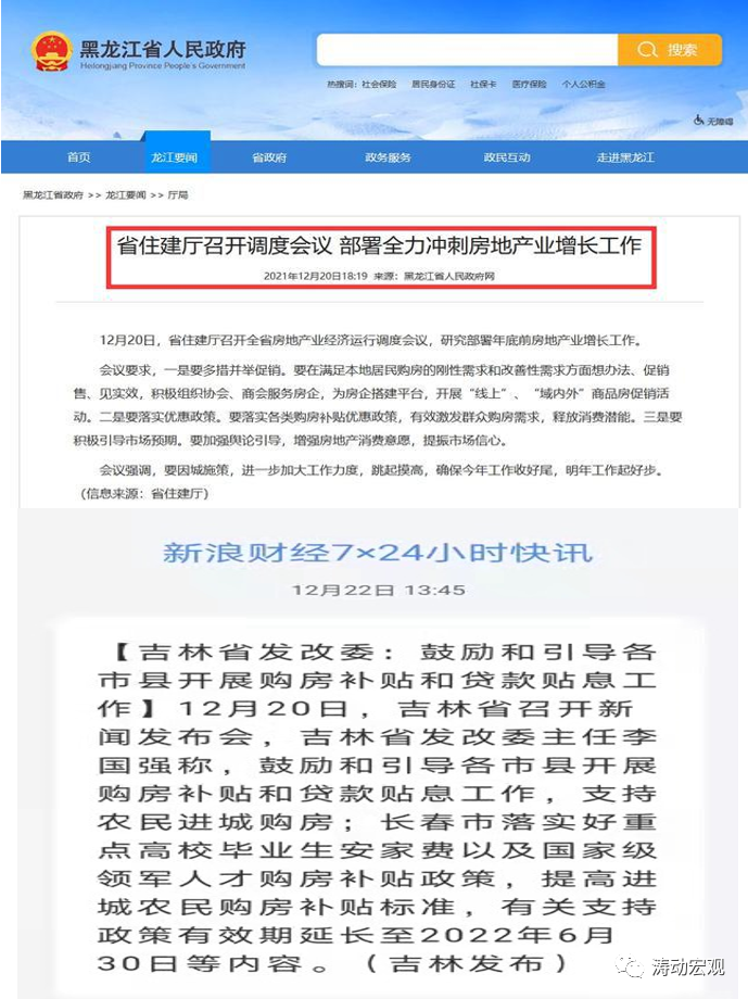 例如,2021年12月20日,黑龍江省政府發(fā)布《省住建廳召開調度會議部署全力沖刺房地產業(yè)增長工作》(21日這一新聞便官網被撤下),稱黑龍江省住建廳召開全省房地產業(yè)經濟運行調度會議,要求要想辦法促銷售,落實購房補貼政策,提振市場信心。