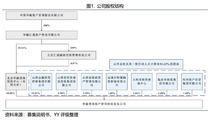 公司成立于2016年,是山西省內(nèi)第一家地方資產(chǎn)管理公司,由中國(guó)華融與山西省政府共同組建。初始注冊(cè)資本為30億元,中國(guó)華融和山西省政府分別持股51%和49%;2019年12月原股東之一的山西金融投資控股集團(tuán)增資1.3億股,注冊(cè)資本增至31.30億元,中國(guó)華融的持股比例下降至48.88%,山西省股東簽署《一致行動(dòng)人協(xié)議》,山西金控及其一致行動(dòng)人合計(jì)持有華融晉商51.12%的股份。
