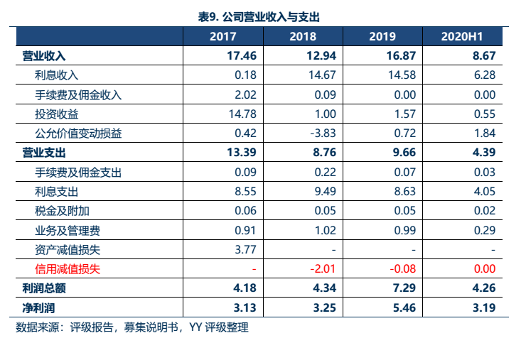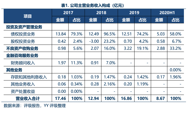公司收入來(lái)源包括利息收入、手續(xù)費(fèi)及傭金收入、投資收益以及公允價(jià)值變動(dòng)損益,利息收入(包括信托貸款、委托貸款和收購(gòu)非金融機(jī)構(gòu)的不良資產(chǎn)包產(chǎn)生的利息收入)為公司最主要收入來(lái)源(2018年新會(huì)計(jì)準(zhǔn)則下,債權(quán)投資產(chǎn)生的收益計(jì)入利息收入)。2019年利息收入14.58億元,其中債權(quán)投資產(chǎn)生的利息收入14.34億元,其余為銀行存款利息。從業(yè)務(wù)細(xì)分看,新會(huì)計(jì)準(zhǔn)則下投資收益主要來(lái)自收購(gòu)和處置金融機(jī)構(gòu)的不良資產(chǎn)以及長(zhǎng)期股權(quán)投資產(chǎn)生的投資收益,前者占比約90%。公允價(jià)值變動(dòng)損益在不同年份之間的波動(dòng)較大,2018年受二級(jí)股票市場(chǎng)影響,股價(jià)下降幅度較大,對(duì)營(yíng)業(yè)凈收入形成拖累。