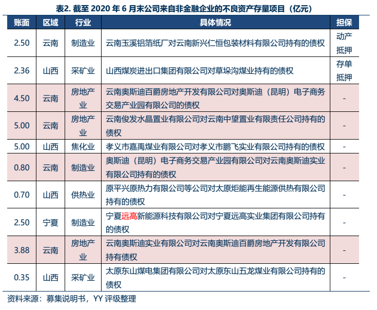不良資產(chǎn)底層債務(wù)人來(lái)看,存量非金融項(xiàng)目主要涉及采礦業(yè)、制造業(yè)和房地產(chǎn)業(yè),其中8個(gè)項(xiàng)目的底層債務(wù)人為民企;約48%投向了房地產(chǎn)業(yè);區(qū)域分布于山西、云南和寧夏地區(qū),云南地區(qū)占比60%。