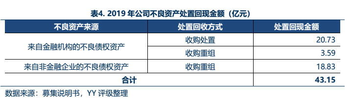 不良資產(chǎn)來(lái)源方面,公司金融類(lèi)和非金融類(lèi)不良資產(chǎn)占比較為均衡。截至2018和2019年末,公司來(lái)自金融機(jī)構(gòu)/非金融企業(yè)的不良債權(quán)資產(chǎn)占比分別為55.48%/44.52%、53.42%/46.57%。