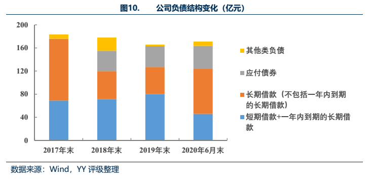 考慮到公司高杠桿經(jīng)營(yíng)的特性,截至2020年6月末,公司資本負(fù)債率為78.87%,小幅下降。有息負(fù)債包括銀行長(zhǎng)期借款、母公司和銀行的短期借款、債券融資,其中短期借款33.50億元,長(zhǎng)期借款89.91億元,債券融資46.00億元。期限結(jié)構(gòu)上看,2017-2019年債務(wù)有短期化的趨勢(shì),短期債務(wù)占比較高。