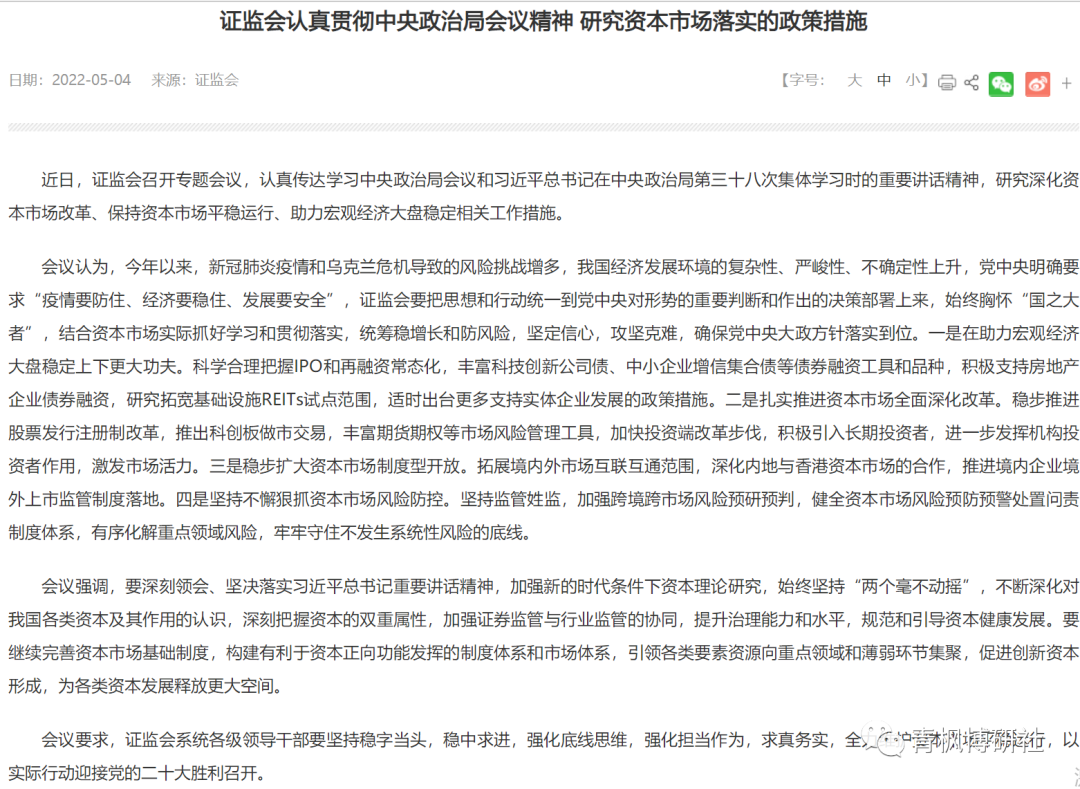 一、5月4日,金融管理部門齊發(fā)聲,公布4月29日政治局會議(參見剛剛,429政治局會議釋放了哪些重大信號?)的學(xué)習(xí)新聞稿,雖然沒有太多增量信息,但穩(wěn)預(yù)期的信號卻比較明顯。之所以選擇在這一天齊刷刷公布新聞稿,理由其實很簡單,主要有兩個: