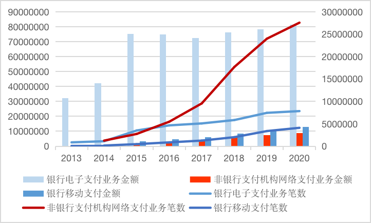 從近些年支付業(yè)發(fā)展看,移動支付依然處于高速增長中。根據央行數據,2015年以后,商業(yè)銀行電子支付總金額基本維持在每年2400到2700萬億元之間,近三年增長速度在5%以內,其中2020年銀行移動支付1232億筆,金額為432萬億元,近幾年金額和筆數的增速均在20%以上。