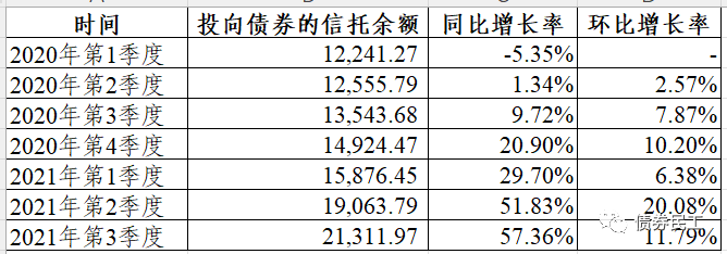 在此前中國信托業協會公布的2021年3季度末信托公司主要業務數據中,信托產品投向債券的規模為2.13萬億元,同比增長分別為57.36%!這個增長速率高的有點嚇人。