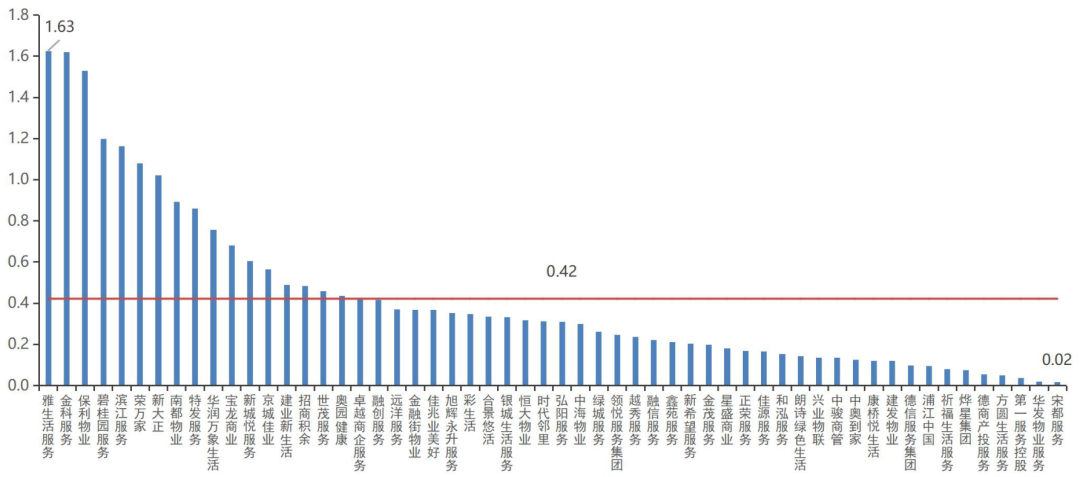 從每股收益上看, 56家上市物企每股收益均值為0.42元,雅生活服務(wù)每股收益最高為1.63元,其次是金科服務(wù)和保利物業(yè),分別為1.62元和1.53元。這三家每股收益明顯高于其他上市物企。