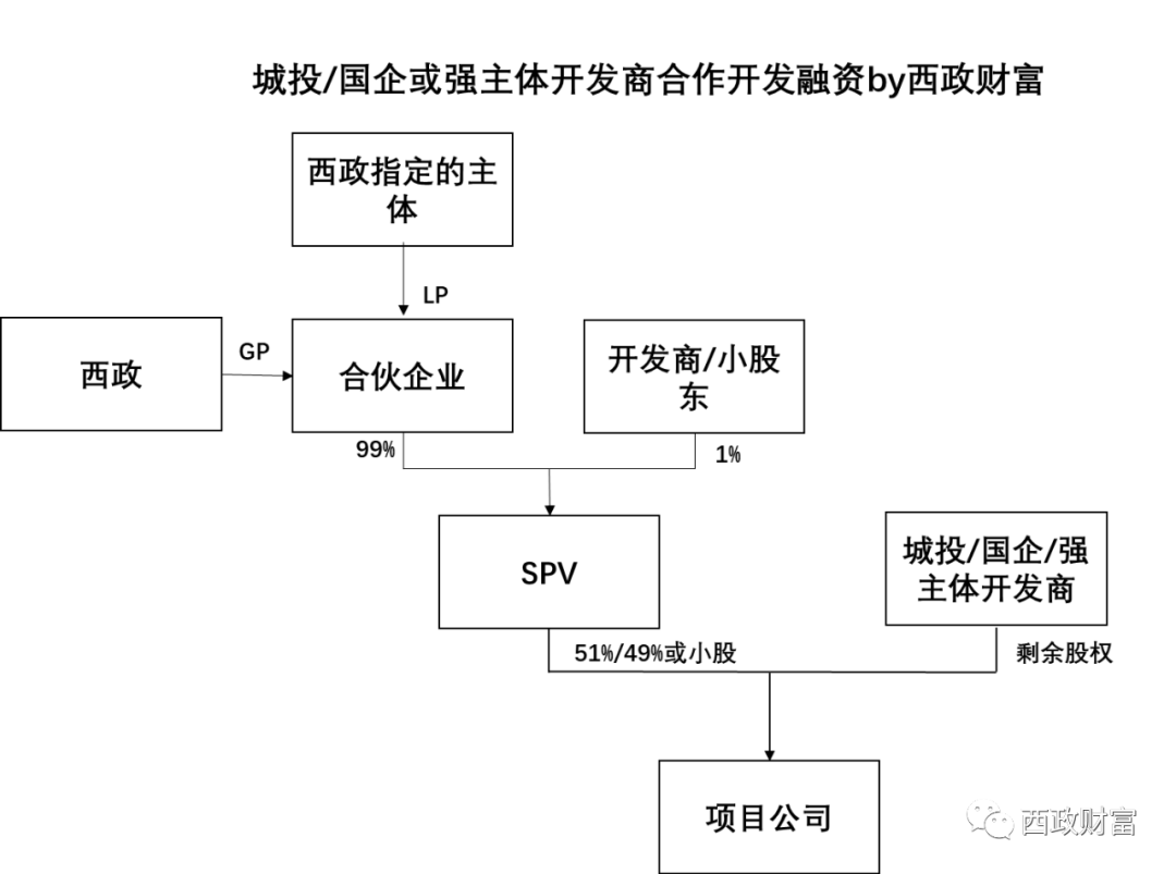 (1)西政(GP)與其指定的主體(LP)共同成立合伙企業(yè),并取得SPV99%的股權(quán),通過SPV實(shí)現(xiàn)對項(xiàng)目公司的投資。