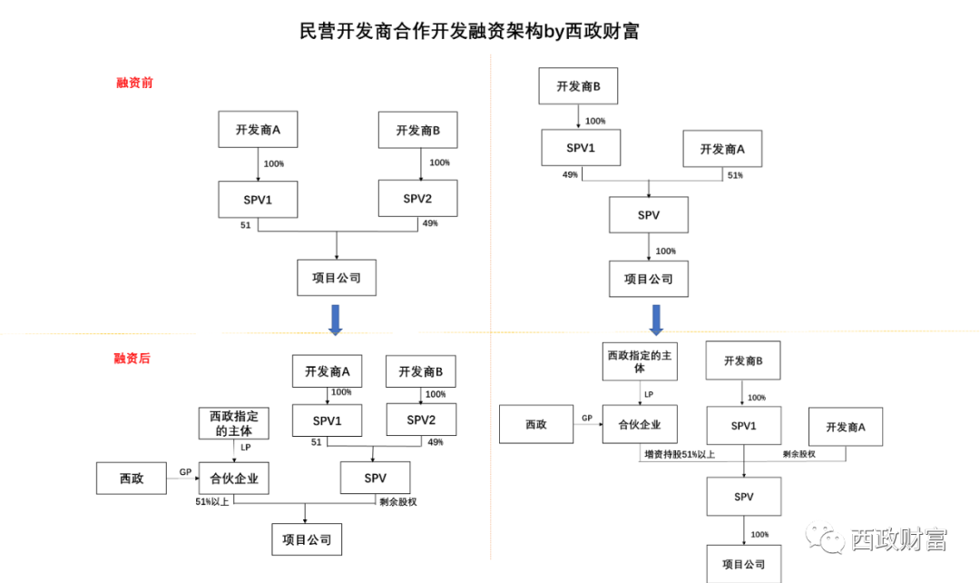 (1)西政(GP)與其指定的主體(LP)成立合伙企業(yè),合伙企業(yè)取得項(xiàng)目公司51%以上的股權(quán)(左圖),或合伙企業(yè)通過增資方式持有SPV51%以上的股權(quán)(右圖),合伙企業(yè)與開發(fā)商約定對賭回購條件。