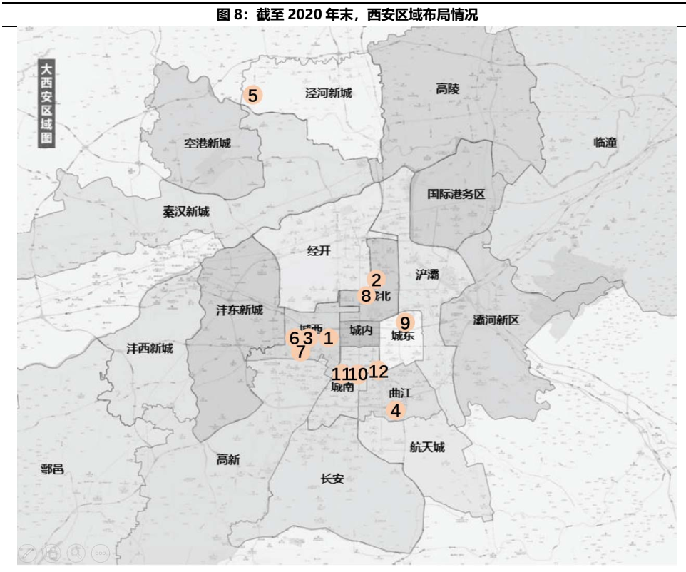 除了西安市場于17年之前存在價格洼地外,金輝集團之所以大規模布局于西安,或基于金輝嘗試利用獲取綜合用地降低土地成本,而于西安大規模布局。目前,金輝集團位于西安的12個存量項目存在較大體量的綜合商業自持,除了涇河小鎮或面臨去化壓力外,其余項目的區位較為核心。
