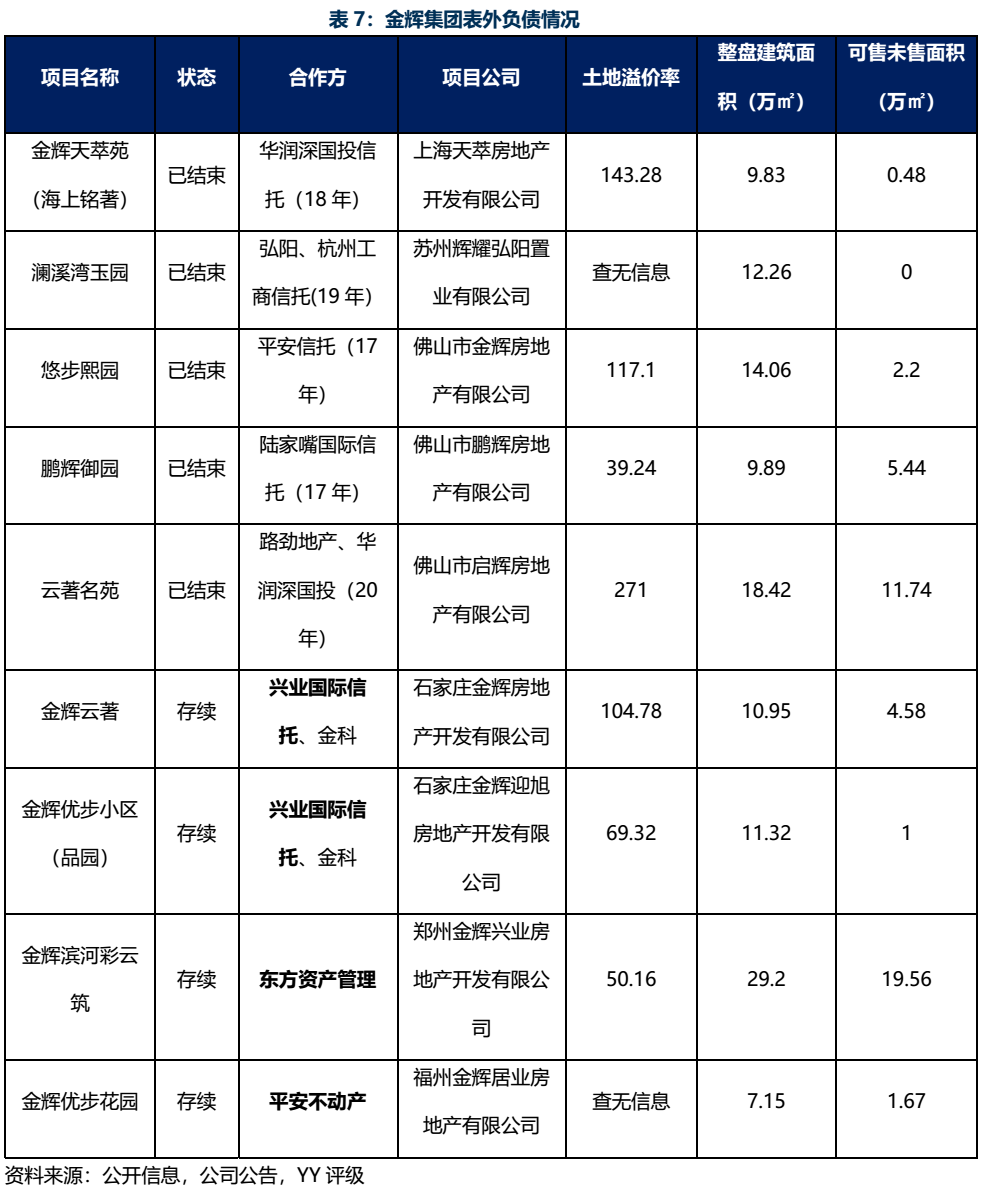 根據項目公司與樓盤名比對參考,羅列如表7的表外負債可見,金輝集團的存續表外負債情況較少,多為已結束的前融資金。然而,也可見個別的土地溢價率發現,非標資金多參與了高單價地塊的投資,因此后續仍需關注金輝集團選擇的投資運營模式,跟蹤其招拍掛溢價情形,關注隨著高溢價拿地而來的表外負債。