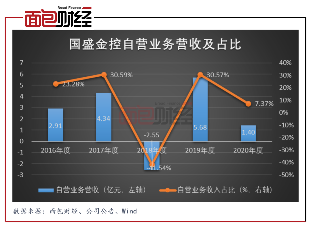 2020年,國盛金控的自營業(yè)務規(guī)模大幅下降。公司稱報告期間,出于控制風險的考量,降低了自營業(yè)務的規(guī)模。當期公司證券自營業(yè)務收入1.40億元,較2019年減少4.28億元,降幅達75.31%。主要受此影響,期末公司的交易性金融資產為56.06億元,較上年末下降44.77%。