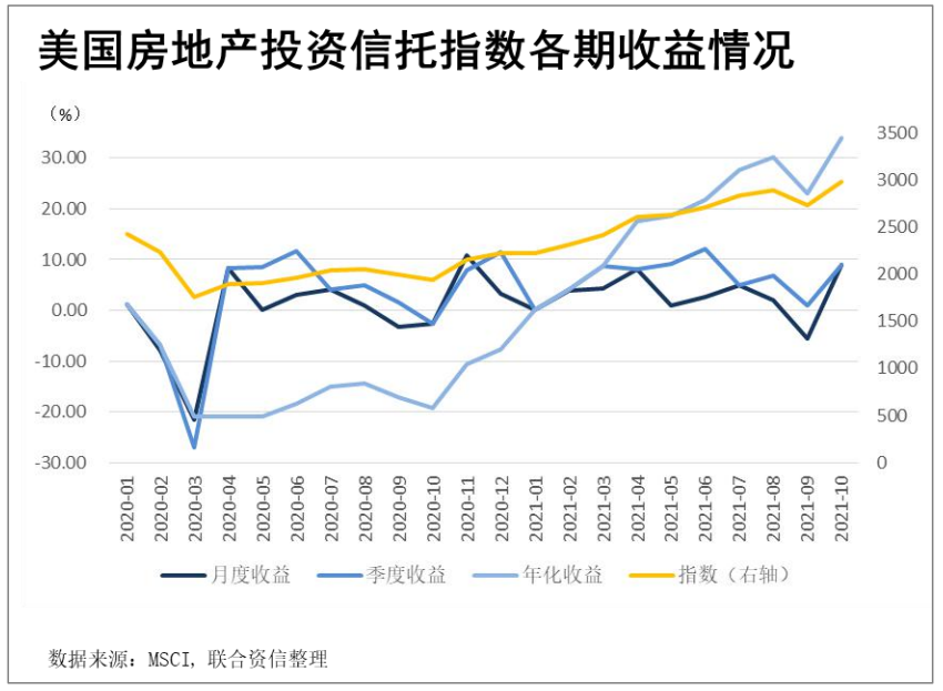 4.隨著全球高通脹的持續和房地產市場的火爆,美國房地產投資信托指數(MSCI US REITs)收益上揚;且因其與其他資產的相關性較低的特性,受到追捧。