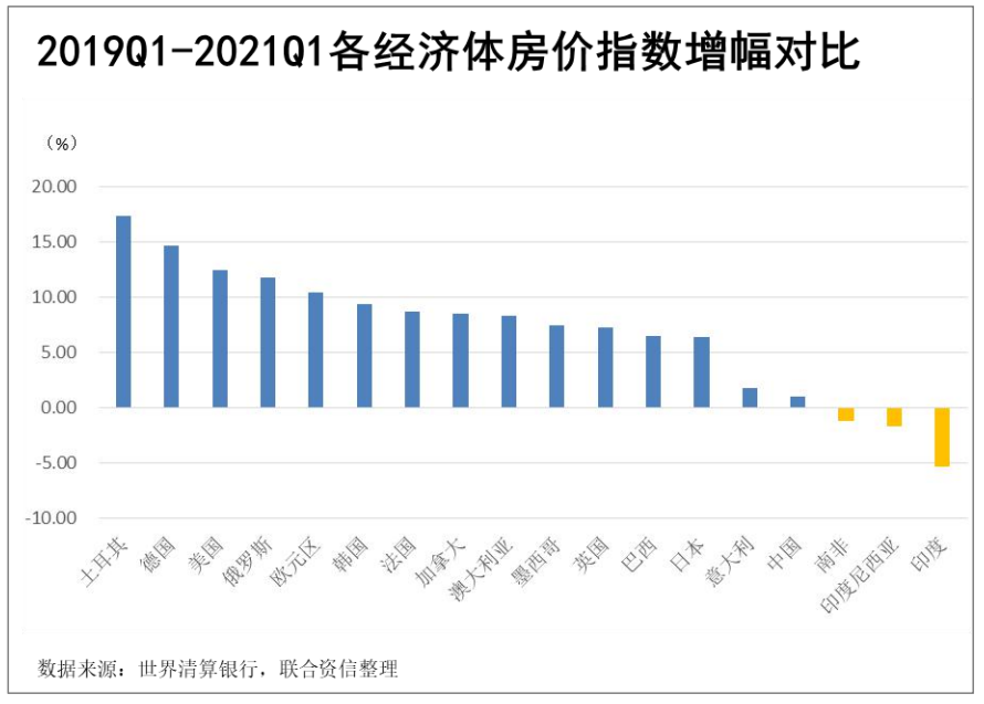 3.具體來看,自2019年一季度以來發達經濟體的房價都呈現明顯的上揚,其中美國和歐元區的房價更是增長超過10%;而新興經濟體的房價增幅則出現兩級分化,其中土耳其以近18%的增幅位居榜首,印度、南非等國則呈下跌趨勢。