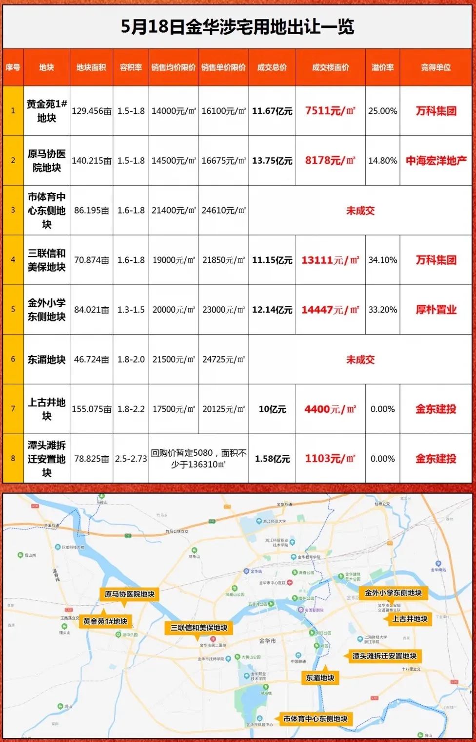 5月18日,金華第一批限價(jià)地塊完成集中出讓?zhuān)渲?宗政府托底、2宗流拍、4宗成交