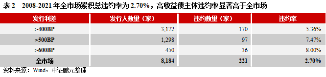 ①高收益主體違約率顯著高于全市場。2008-2021年全市場信用債發(fā)行人的總違約率為2.70%,而發(fā)行利差>400BP的發(fā)行人違約率為5.36%。
