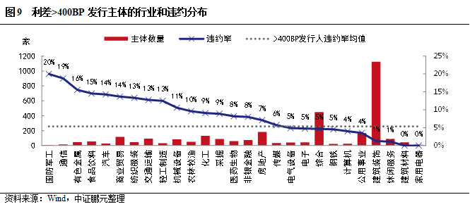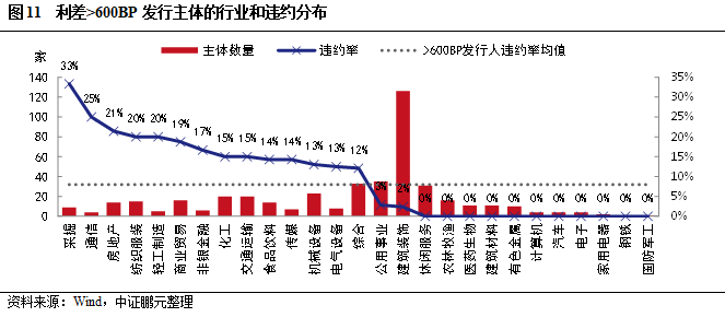 行業(yè)分布和違約特征方面,從統(tǒng)計數(shù)據(jù)來看,建筑裝飾是高收益主體數(shù)量最多的行業(yè),僅其一個行業(yè)就占全部高收益主體的35%;其次是綜合、房地產(chǎn)、公用事業(yè),也是一級市場高收益?zhèn)l(fā)行主體的主要分布行業(yè)(圖8)。前四個行業(yè)占全部高收益主體的60%。但建筑裝飾、綜合行業(yè)的高收益主體中有較大比例為城投,也就是說有相當(dāng)數(shù)量的弱資質(zhì)城投其發(fā)行利差還是偏高的。