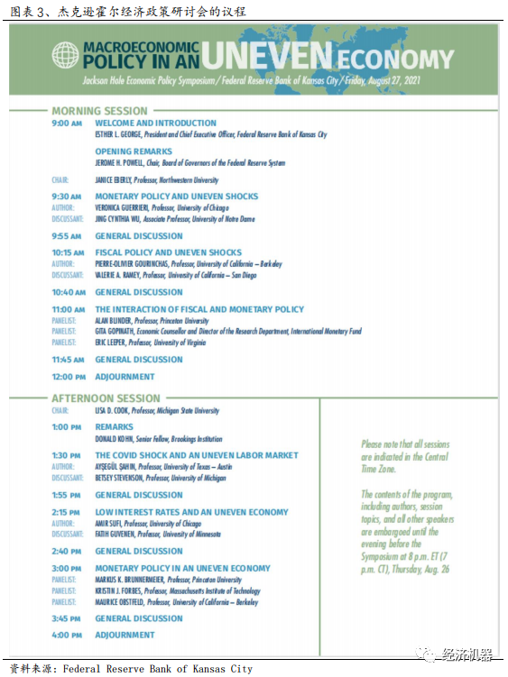 根據議程,杰克遜霍爾經濟政策研討會包括上午和下午兩個時段,其中上午時段從九點開始到十二點結束,而下午時段從一點開始到四點結束。具體來看,九點到九點半,會議舉辦方負責人堪薩斯聯儲主席George將致歡迎辭,隨后美聯儲主席Powell將通過堪薩斯城聯儲的YouTube頻道向公眾直播,全市場都在關注鮑威爾即將做出的聲明,尤其是他是否將做出Taper的表述。九點半之后則開始了學術討論,上下午學術討論的議程比較一致,都是兩個單人專題演講加一個三人小組討論。