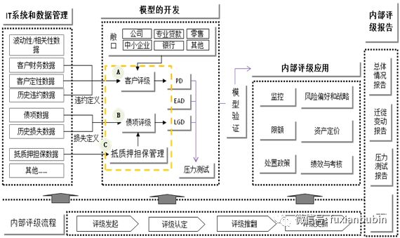 信用風險計量是現(xiàn)代信用風險管理的基礎(chǔ)和關(guān)鍵環(huán)節(jié),信用風險計量經(jīng)歷了專家判斷法(即長期在一線業(yè)務骨干在承擔信用風險過程中逐步發(fā)展并完善起來的傳統(tǒng)信用分析方法,主要考察與債務人相關(guān)的聲譽、杠桿和收益波動性等指標,及與市場相關(guān)的經(jīng)濟周期、宏觀經(jīng)濟政策、利率水平等指標)、信用評分模型到違約概率模型三個主要發(fā)展階段。現(xiàn)在對于信用風險的計量主要依賴于對借款人和交易風險的評估,主要是從客戶評級維度和債項評級維度兩個方向展開。