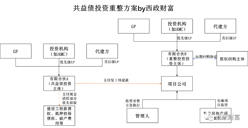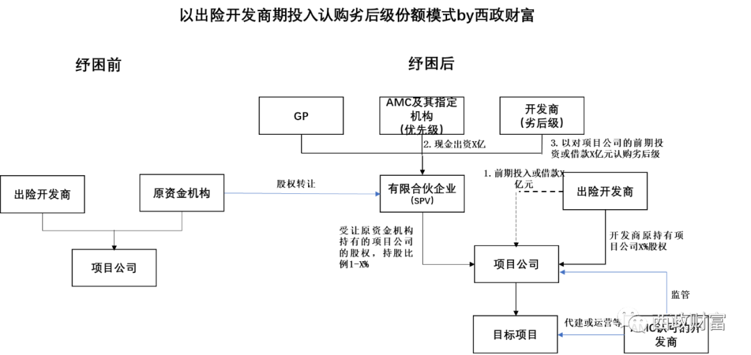 對于一些投資機(jī)構(gòu)前期對出險(xiǎn)開發(fā)商項(xiàng)目進(jìn)行投資后,目前一些AMC通過與出險(xiǎn)開發(fā)商搭建優(yōu)先劣后架構(gòu),由開發(fā)商將對項(xiàng)目的前期投入認(rèn)購劣后級的方式承接投資機(jī)構(gòu)已投入部分,并通過AMC指定的開發(fā)商參與項(xiàng)目后續(xù)的開發(fā)建設(shè),并獲取開發(fā)收益。