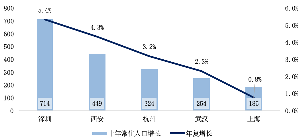 一方面,人口自然流入落戶帶來龐大購房“外需”。對比“七普”和“六普”人口數據,深圳、西安、杭州、武漢等近十年常住人口增量顯著。其中深圳增長達714萬人,西安、杭州、武漢3城年復增長量均超2%。持續新增的新市民帶來源源不斷的新增自住購房需求。
