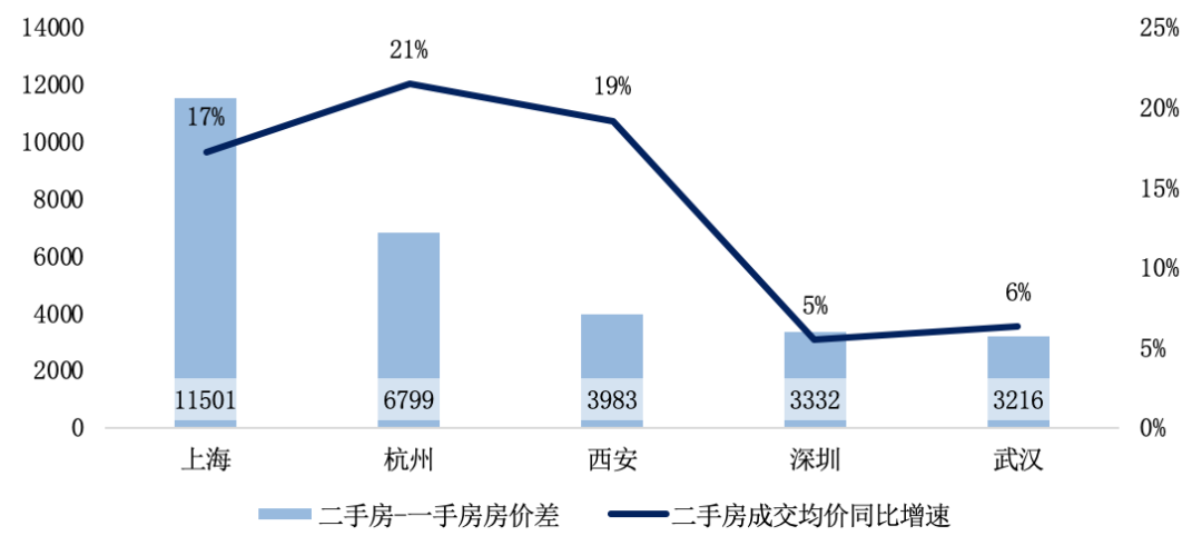 仍以上述5個核心城市為例,2021年前11月,上海、杭州和西安三城全市二手房均價漲幅最為顯著,均超15%。其中杭州二手房價同比漲幅達21%。結合新房房價來看,上海和杭州一二手房房價差異尤為顯著,其中上海全市一二手房價價差超1萬元/平方米。