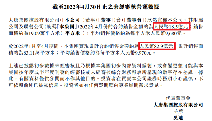 比如杠桿地產看到,2022年4月,大唐集團控股合約銷售額為18.5億元,前4月合計82.9億元。