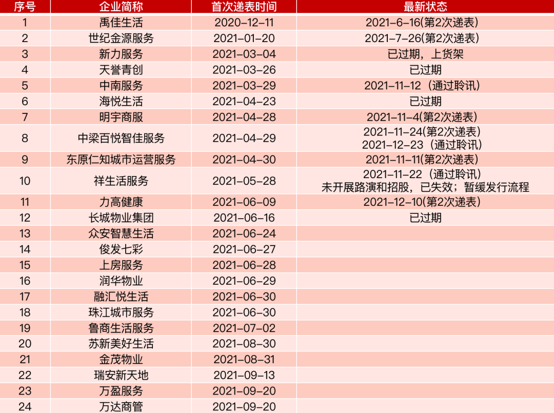 在市場的冰凍期,監管層考慮、投資人離場心態、母公司急需資金紓困以及企業自身意愿的多重因素影響下,2021年下半年待上市物企被擺上貨架出售、推遲上市或者已經通過聆訊也暫停上市。