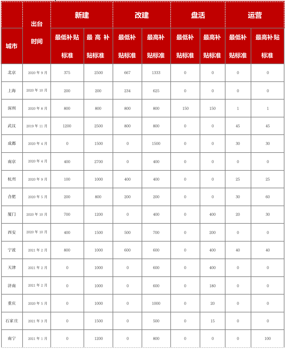 不同城市之間補(bǔ)貼標(biāo)準(zhǔn)差異較大,整體來說補(bǔ)貼發(fā)放還是以新建、改建類項(xiàng)目補(bǔ)貼為主,部分城市對(duì)盤活類、運(yùn)營類項(xiàng)目有補(bǔ)貼。既所謂的大錢補(bǔ)供應(yīng),小錢補(bǔ)運(yùn)營。