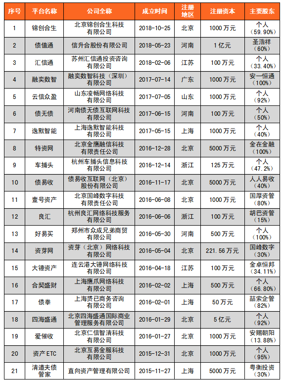 在線催收類平臺約有22個,其中廣東注冊平臺最多,有7個,其次是上海3個,2個區(qū)域合計占比45.5%。永雄集團(tuán)于2018、2019年兩次赴美上市,卻均以失敗告終。